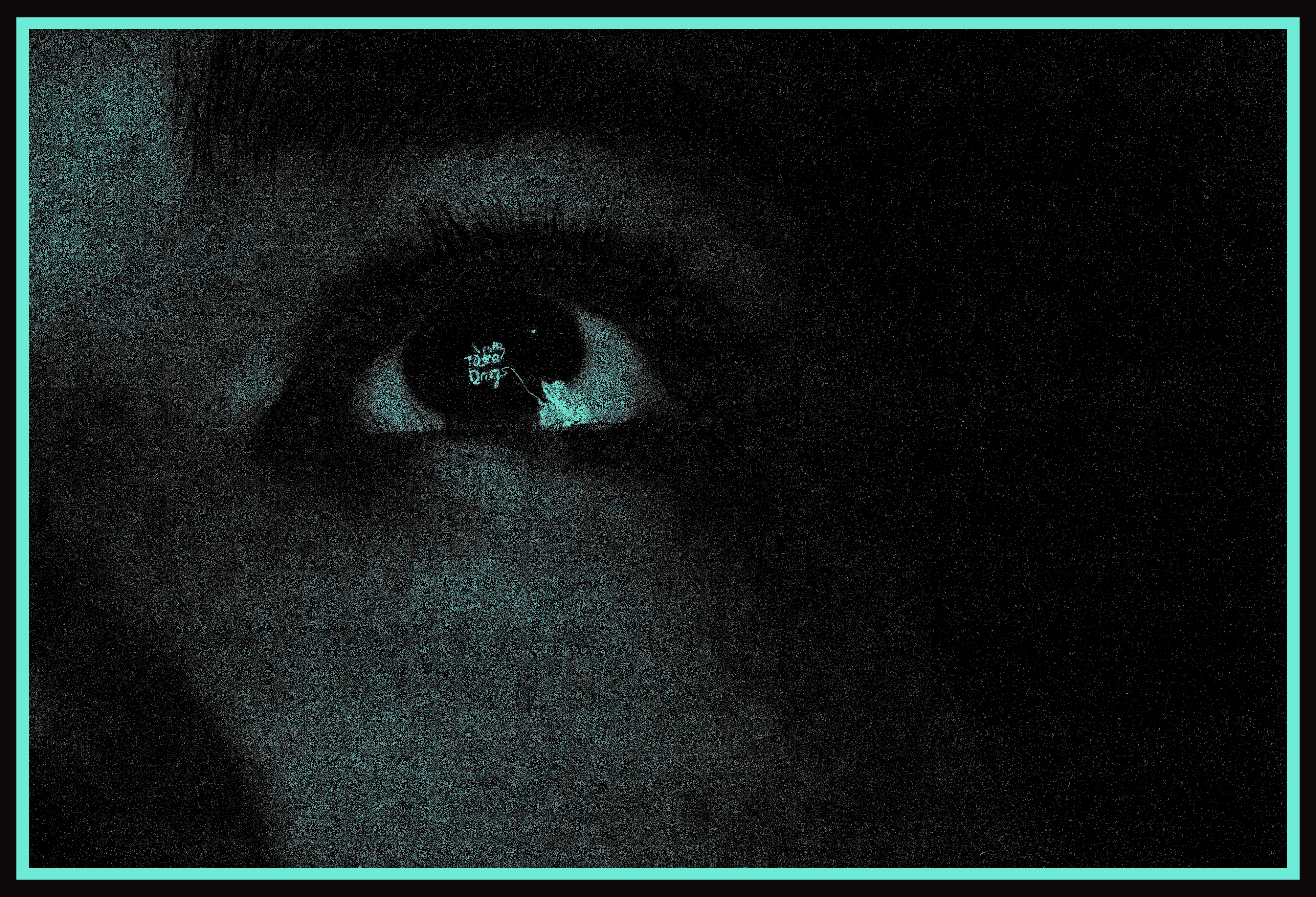 Photographed in the dilated eye of the subject, this image captures a neon sign that reads “We Take Drugs” : our generational confession.